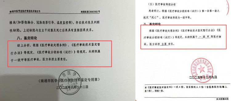 2025年12月9日,江苏省医学会出具《医疗事故鉴定书》,认定该病例属于一级甲等医疗事故,医方承担主要责任。