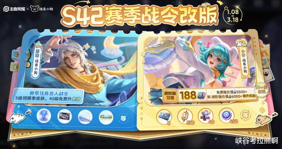 S42赛季最大的一个亮点就是战令系统的改版,988点券的典藏版战令移除,388点券的进阶版战令价格降至188点券,战令皮肤一款为史诗,另一款还可以从勇者升级为史诗,并且是和“线条小狗”的联动皮肤。