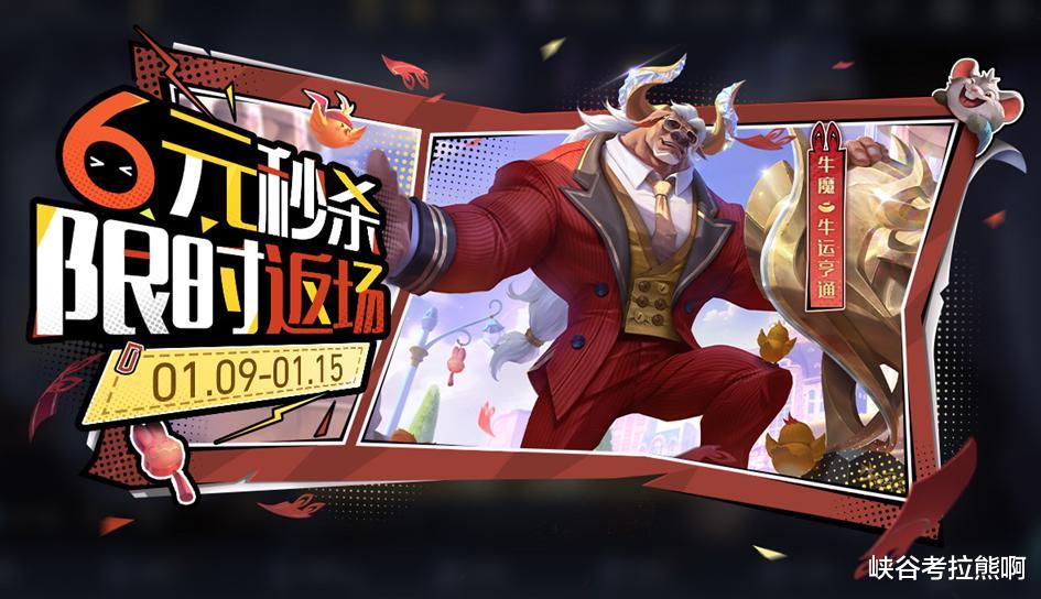 【牛魔牛运亨通】60点券秒杀皮肤将于1月9日上线,由于赛季任务将从S42起整合至赛季战令,赛季商店将取消,所以这款皮肤在商城额外直售返场一周,且本次返场后将不再以直售形式返场。