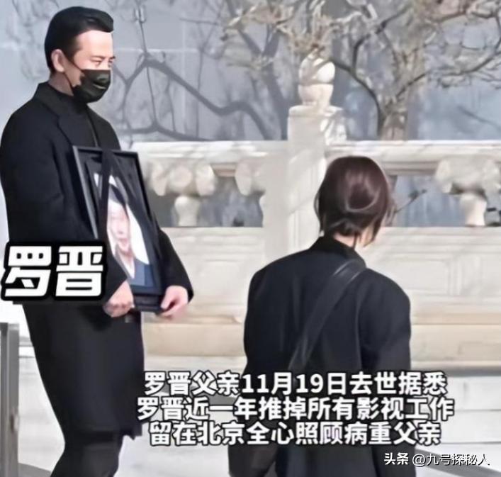 罗晋捧着父亲的遗像,脸色苍白,难掩悲痛。