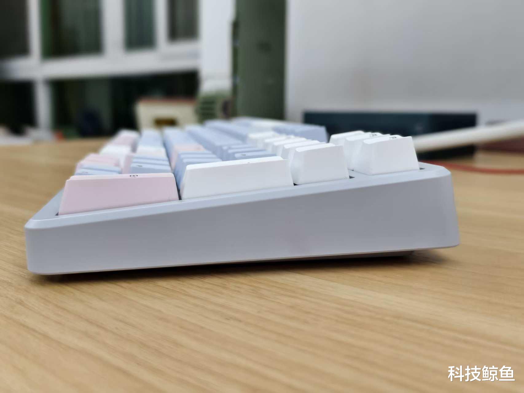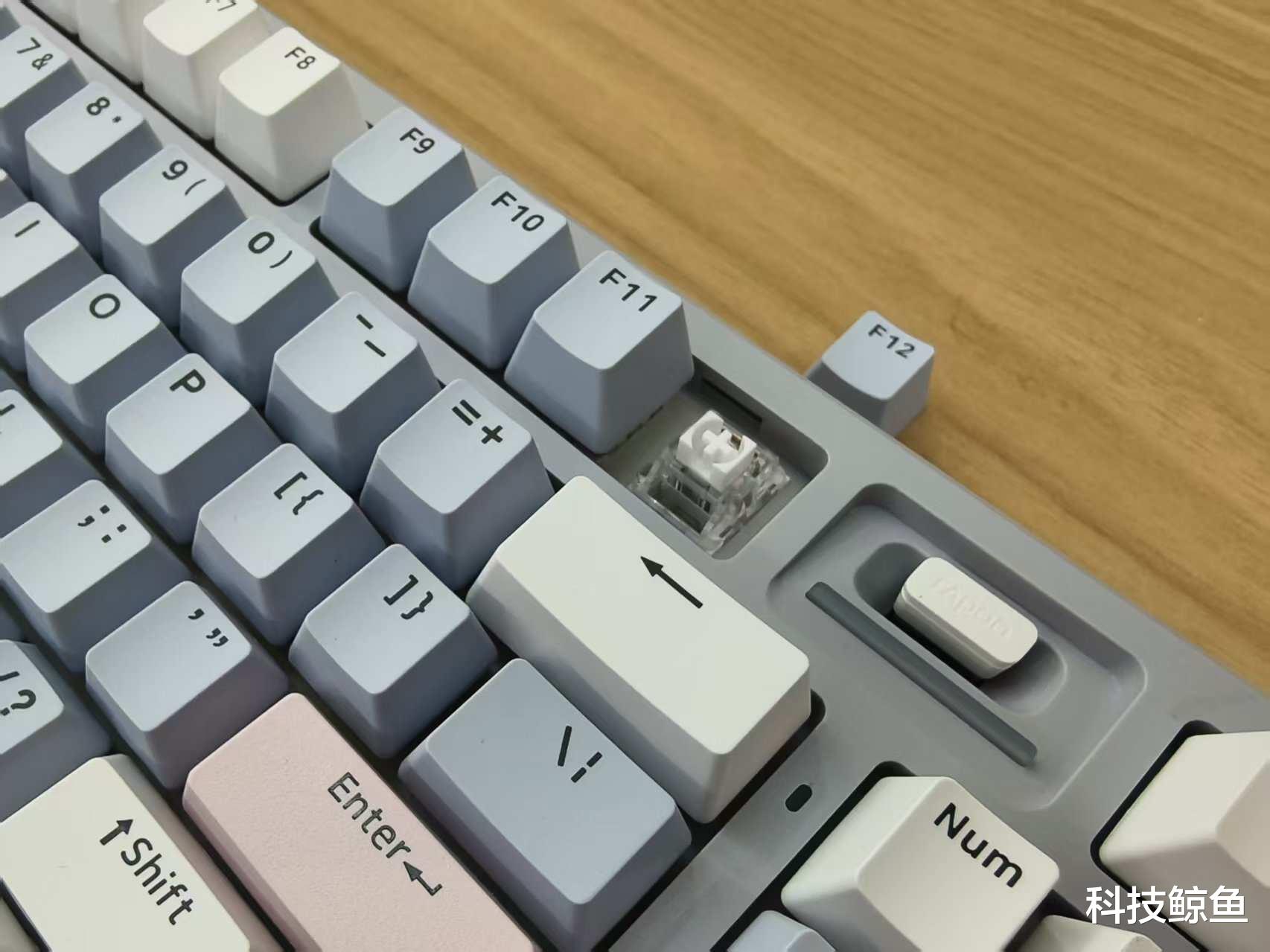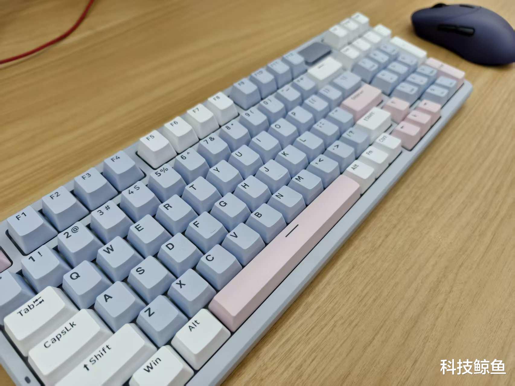 若说鼠标是“减负担当”,V700DIY-98长续航版键盘便是“效率利器”。这款莫奈仙踪配色精致有科技感,98%紧凑配列保留数字小键盘,不过底部的右方向键并入到小键盘内,顶替了原来“0”键的位置,这可能对于熟悉小键盘用户的人来说有点不适合。