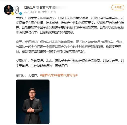 DoNews1月13日消息,前比亚迪高管赵长江刚刚发文宣布正式加入奇瑞旗下智界汽车。其微博认证已改为:智界汽车执行董事及
