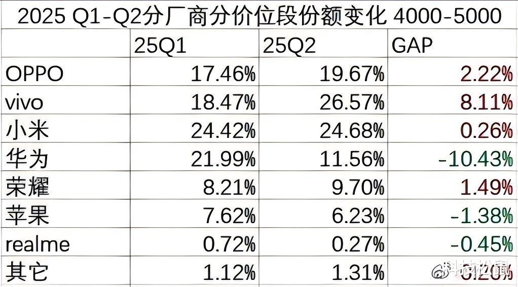 国内高端手机市场,华为的市场份额仅次于苹果,断层式领先4大安卓品牌。华为高端手机最强的价位段是5K-6K价位段,其次是6K以上价位段,4K-5K价位段华为的市场份额并不高。近日,知名爆料博主“RD观测”放出了各品牌4K-5K价位段Q1-Q2的市场份额变化情况,Q2对比Q1,华为的市场份额下滑了10.43个百分点。