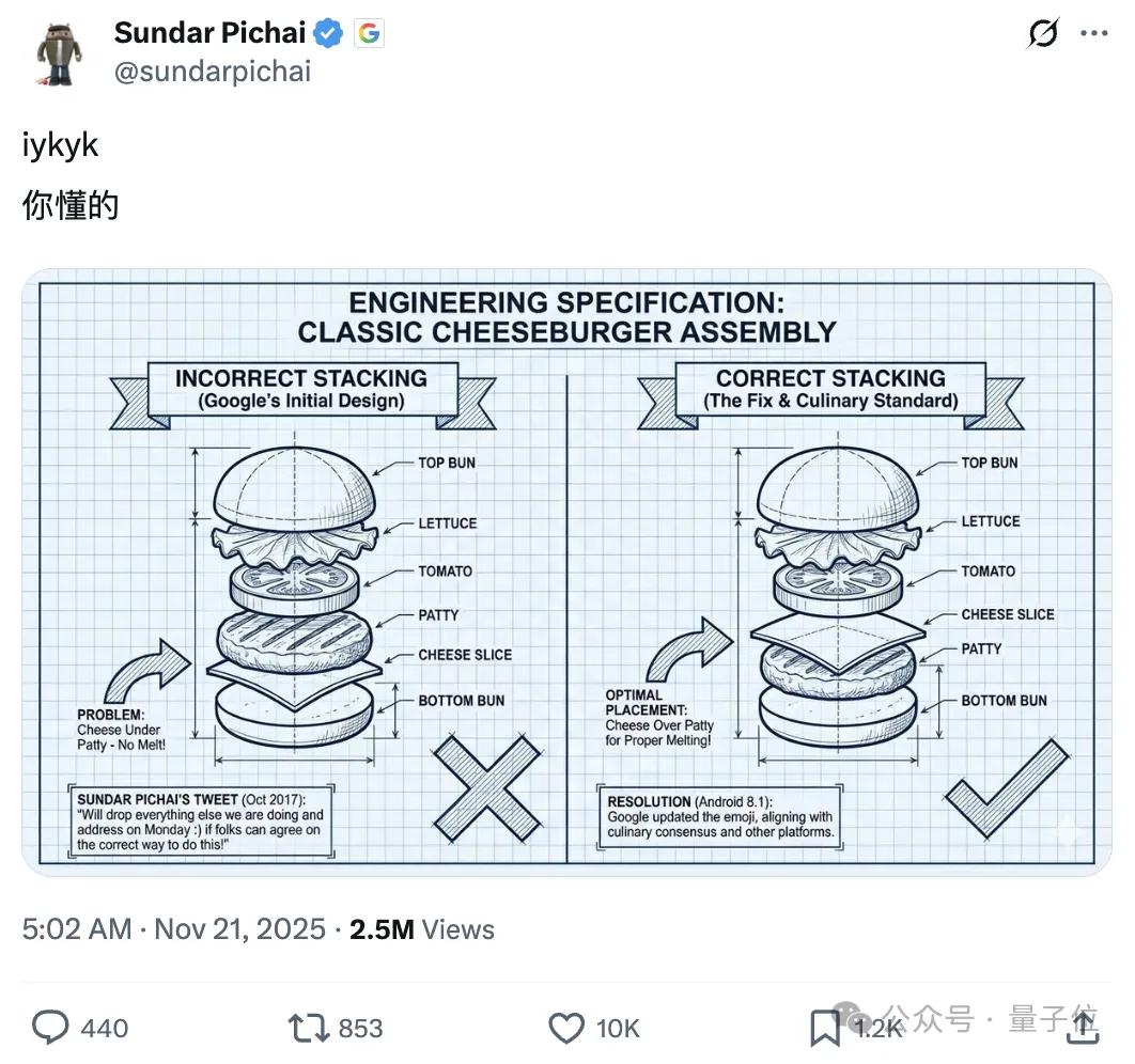 劈柴哥当年半开玩笑地道歉,调侃谷歌要“放下所有工作”解决芝士汉堡emoji的错误结构。后来在Android 8.1系统中,谷歌把emoji修正为芝士在肉饼上的版本。
