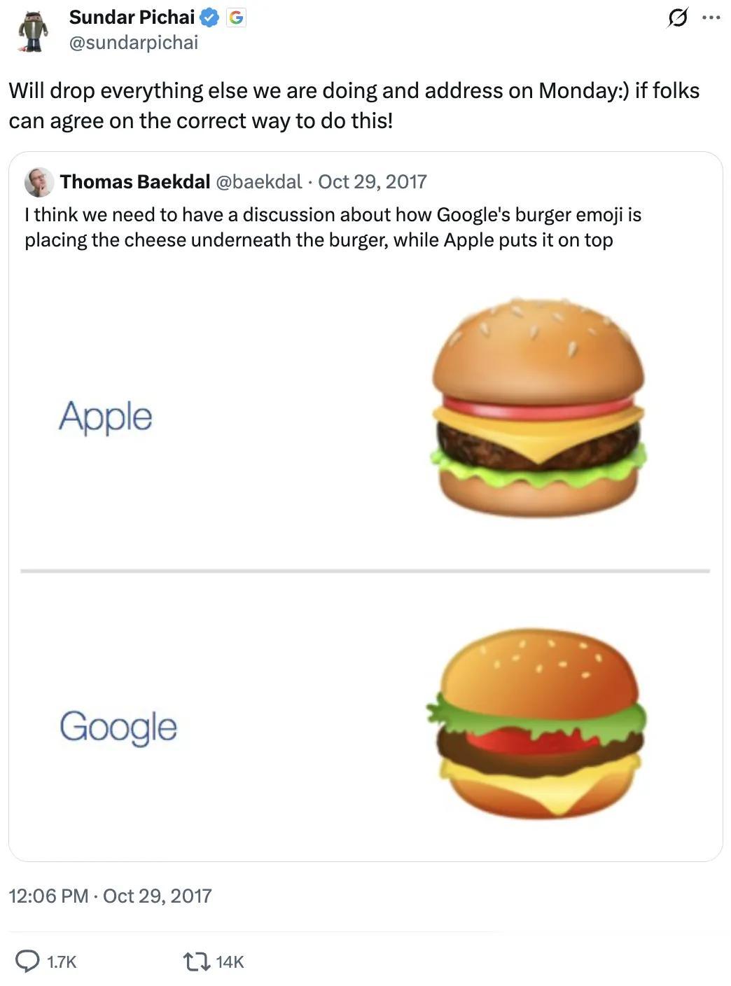 2017年,谷歌为安卓手机推出了一个芝士汉堡emoji,把芝士放在了肉饼下面,被眼尖吃货注意到,引发网友群嘲。