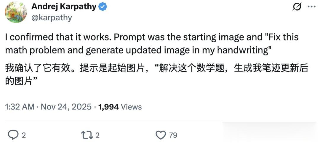 随后卡帕西验证后表示Nano Banana的确能做到,prompt是起始图片+“解决这道数学题,然后用我的手写字体生成更新后的图片”。