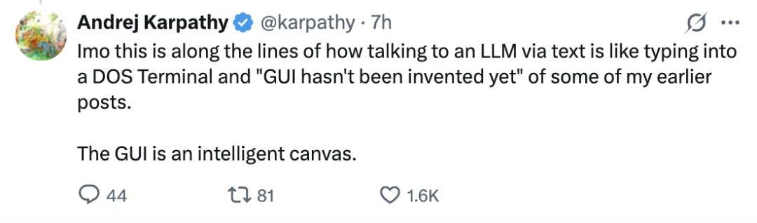 在卡帕西看来,现在用文本和大模型对话,就像在敲DOS命令行,图形界面(GUI)还没被发明出来一样,而“智能画布”这种可视化、可直接操作的交互方式,才是大模型未来该有的GUI。