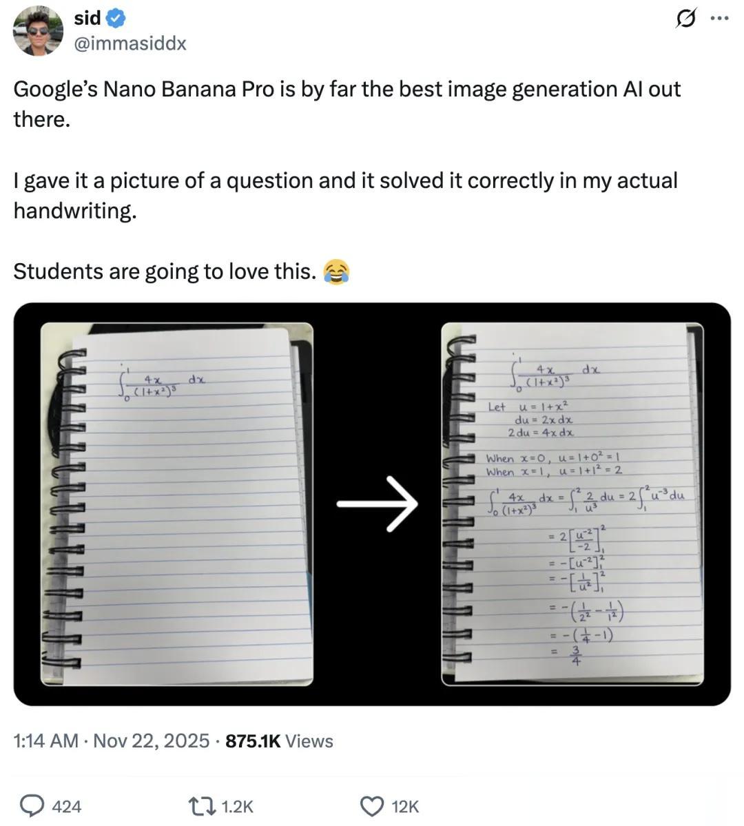 Nano Banana解题字迹像真人亲笔特斯拉前AI总监、OpenAI创始成员Andrej Karpathy(卡帕西)分享用Nano Banana Pro解题也火了。