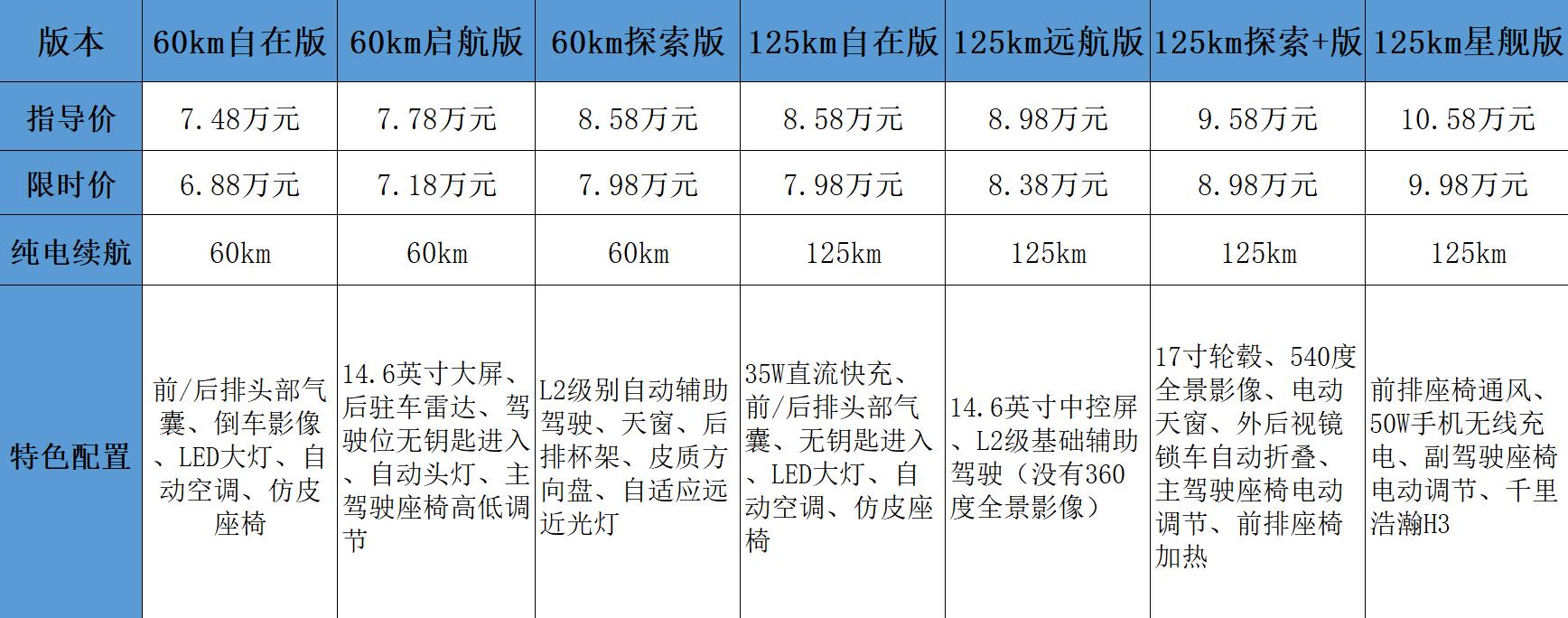 60km探索版在此基础上贵出了8000元,配置上多出了L2级别自动辅助驾驶、天窗、后排杯架、皮质方向盘、自适应远近光灯等功能。
