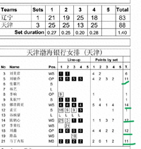 本场比赛技术统计数据如下。副攻刘敏乔11分,主攻巴西娜塔莉亚14分,主攻陈鹤心12分,接应刘鑫12分,副攻马丁内兹11分。天津女排五人得分上双。