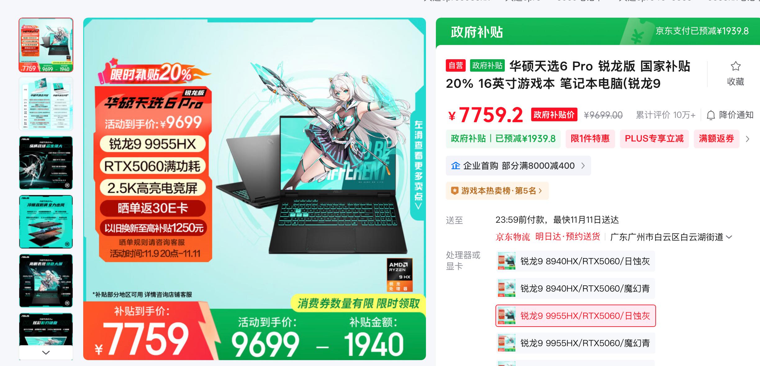 核心CPU+GPU配置:R9-9955HX+RTX5060