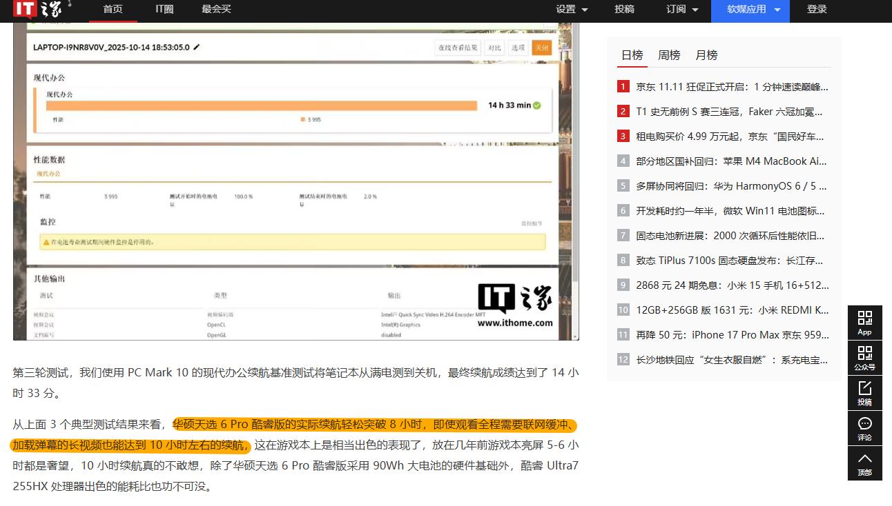 而这带来的最明显的提升就是续航能力,在科技媒体“IT之家”的博主实测中,该机实际续航轻松突破 8 小时,即使观看全程需要联网缓冲、加载弹幕的长视频也能达到 10 小时左右的续航,这正是内置的90Wh大电池与酷睿 Ultra7 255HX 处理器出色的能耗比共同作用下才有的成绩。