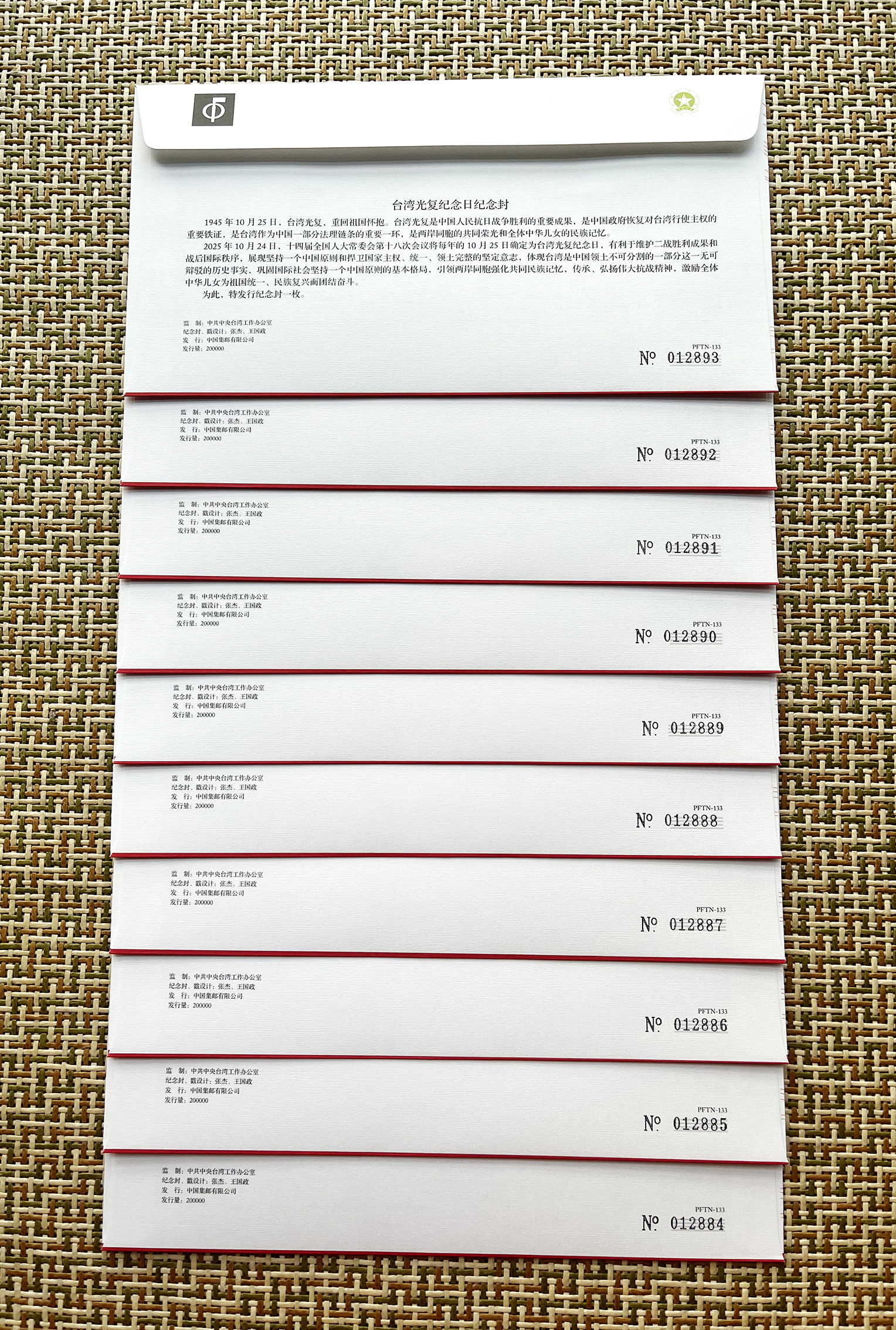 台湾光复纪念日纪念封是中共中央台湾工作办公室监制、中国集邮有限公司于2025年10月25日发行的纪念封,采用“一套一枚”形式,贴《长城》个性化服务专用邮票并印制纪念戳,售价3.2元人民币。该日期为台湾光复纪念日,源自1945年10月25日台湾省接受日军投降典礼的历史事件。2025年10月24日,十四届全国人大常委会第十八次会议通过决定,以法律形式将10月25日设立为台湾光复纪念日,明确国家通过多种形式举行纪念活动。 纪念封邮票印有"祖国必须统一,也必然统一"字样。