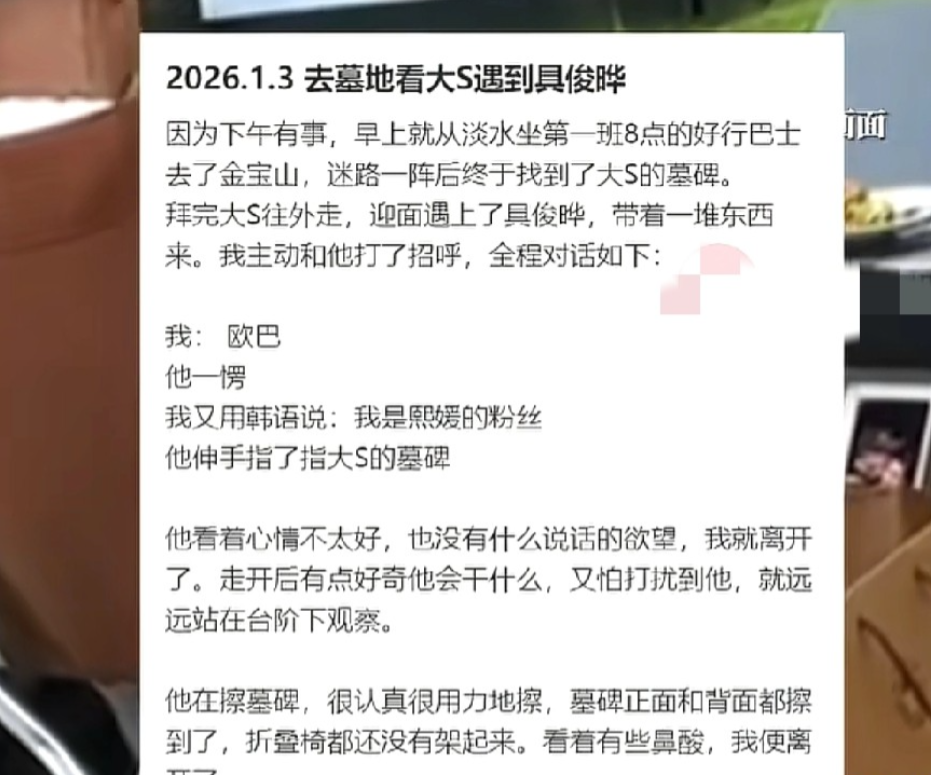 1月3日,一个看似平常的日子,却因一位网友的偶遇而变得不平凡。在静谧的大S墓地前,一个身影格外引人注目——具俊晔。他手持纸巾,小心翼翼地擦拭着大S的墓碑,脸上那抹难以掩饰的哀伤,仿佛在与逝去的爱人进行一场无声的对话。当网友鼓起勇气,以大S粉丝的身份上前搭话时,具俊晔并未言语,只是默默指向墓碑,示意网友去关注那份永恒的纪念。这一幕,被网友记录下来,迅速在网络上发酵,引发了广泛的讨论。