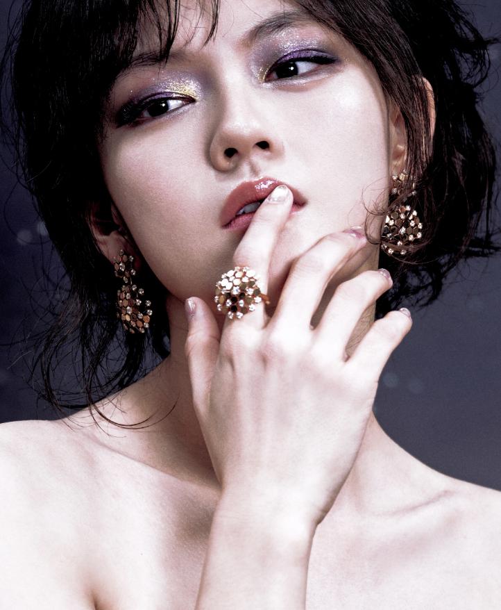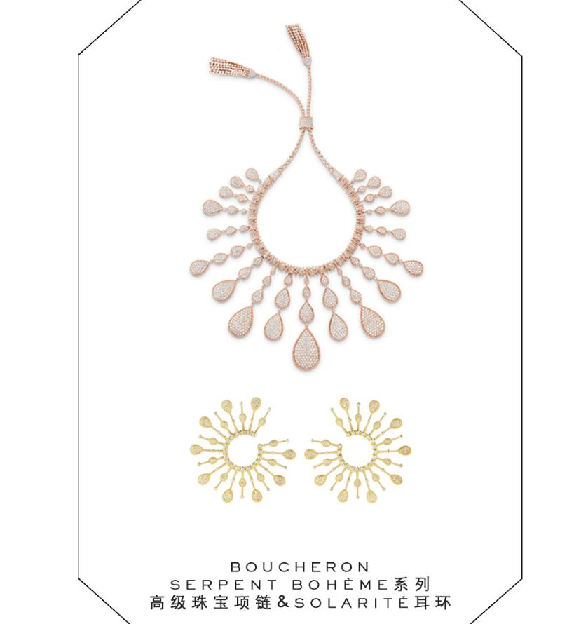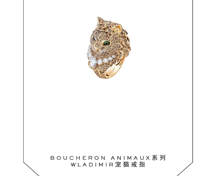 夸张又吸睛的项链来自Serpent Bohème系列高级珠宝,搭配Solarité耳环,隽永鎏金映衬经典水滴;Animaux系列Wladimir宠猫戒指相伴,灵动外形唤醒自然灵感