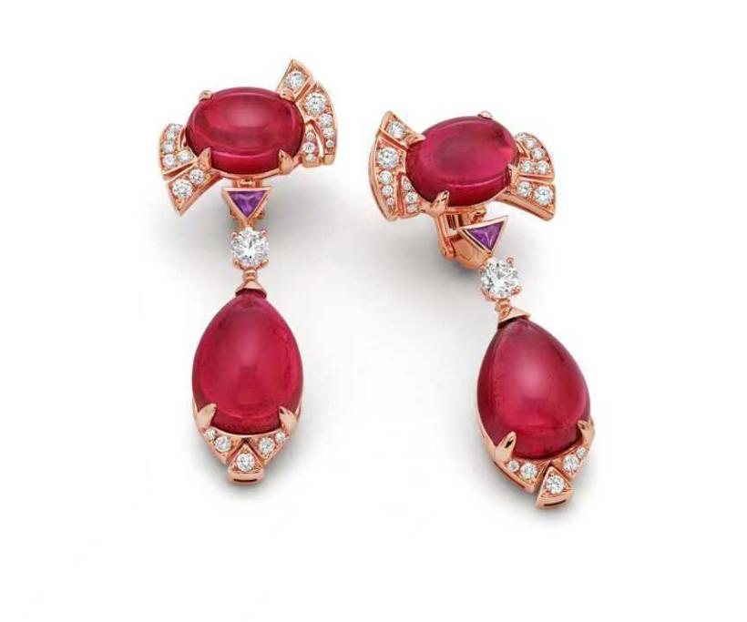 这套Symphony in Pink以“色彩交响诗”为灵感,项链使用以7颗水滴形素面卢比来碧玺,单边耳环分别由椭圆和水滴素面卢比来构成,如绽放的花瓣,散发着迷人的芬芳