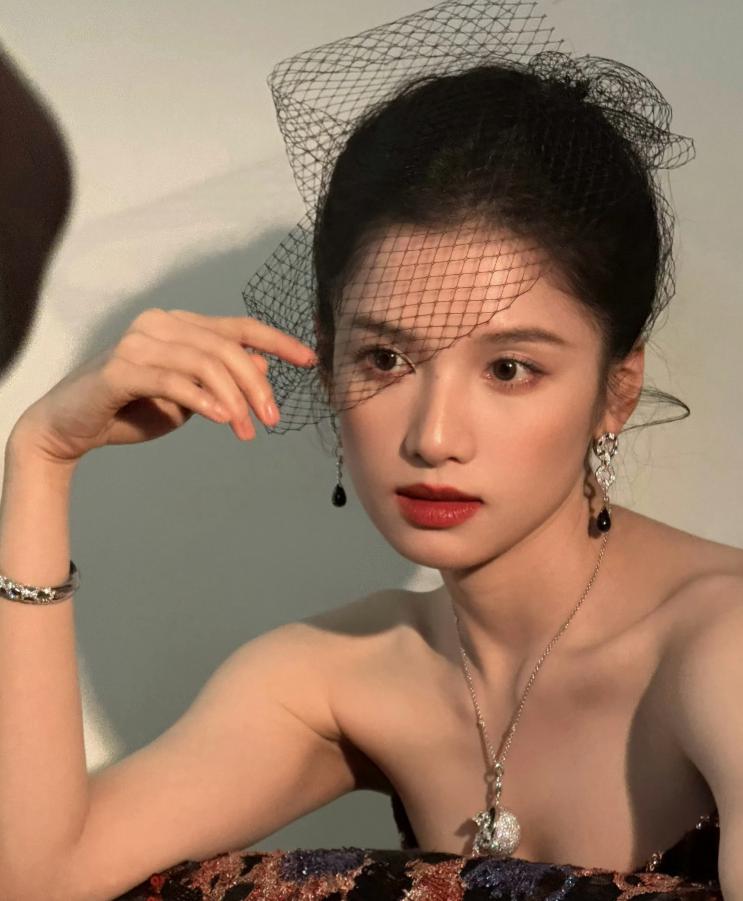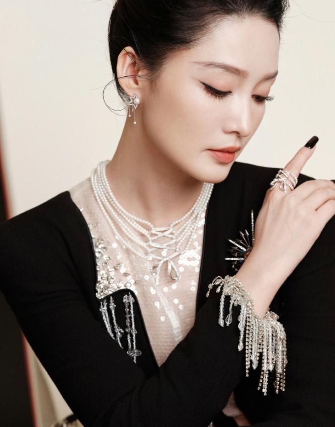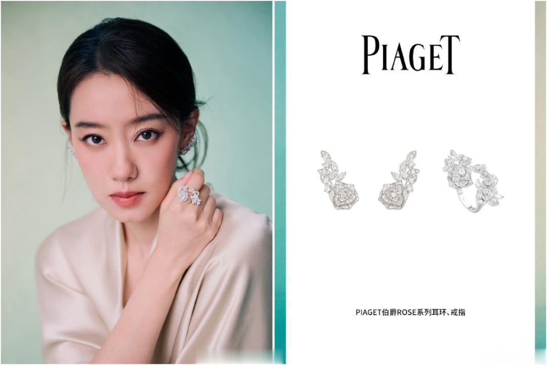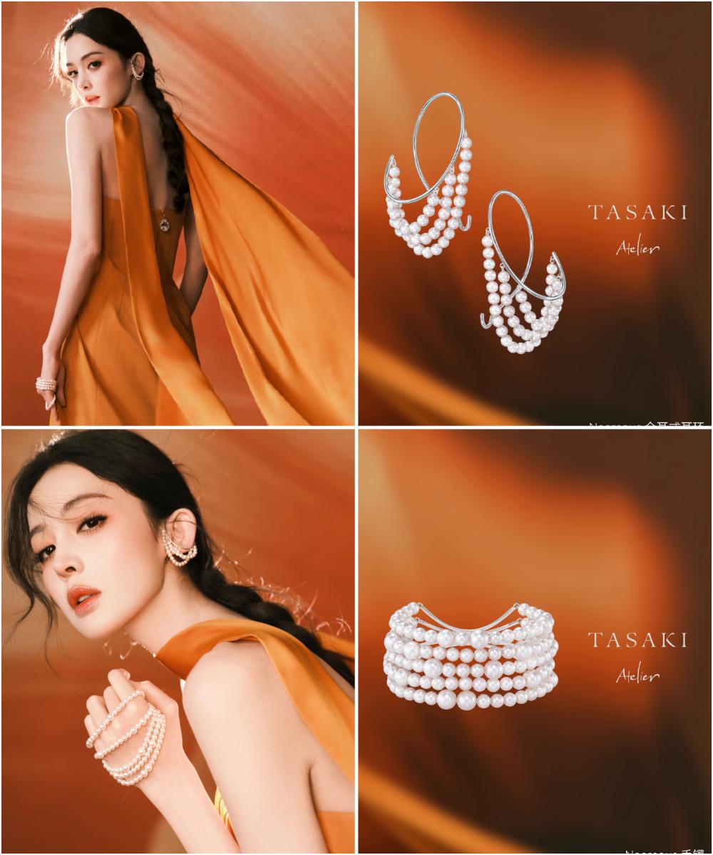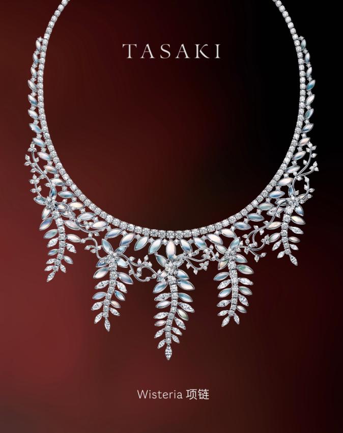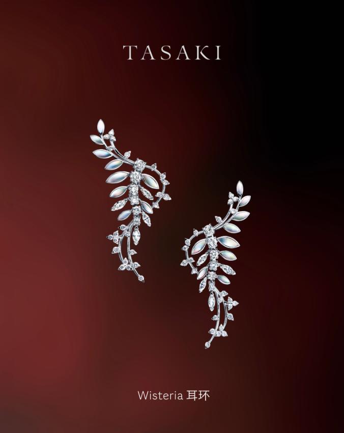 搭配的是TASAKI wisteria(紫藤萝)系列高级珠宝,灵感源自于大自然缤纷的浪漫想象,运用马眼形与圆形钻石不同大小与形状的排列组合,将紫藤花娇柔的姿态细致呈现,创造出充满立体感的优雅轮廓
