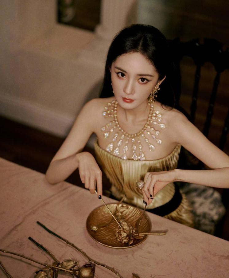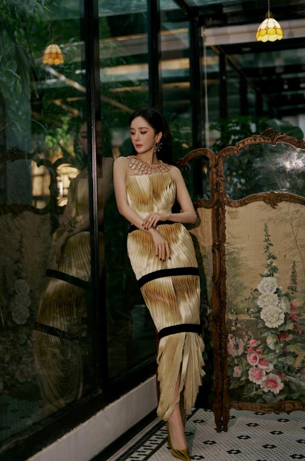 第二个金色造型的礼服来自Schiaparelli高定,搭配来自宝诗龙的珠宝: