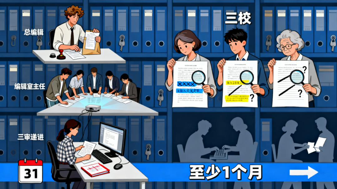 整个“三审三校”流程至少需要1个月,且需多人协作完成,无法压缩成“即时操作”。