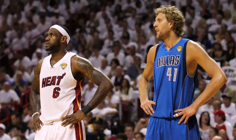然而事情并非大家所想,结局几乎跌破了所有人的眼镜。那一年总决赛,热火在外界普遍看好的情况下,惨遭“滑铁卢”,以大比分2-4不敌小牛,无缘总冠军。詹姆斯整轮系列赛的表现堪称灾难,场均仅得到17.8分、7.2个篮板、6.8次助攻,同时还有4次失误,投篮命中率仅为47.8%,三分命中率更是低至32.1%。与之形成鲜明对比的是,韦德场均贡献26.5分、7个篮板、5.2次助攻,投篮命中率高达54.6%,成为热火阵中唯一稳定的得分点。最终,小牛当家核心领袖德克·诺维茨基凭借场均26分、9.7个篮板的统治级表现,带领球队夺得队史首冠的同时,荣膺FMVP。