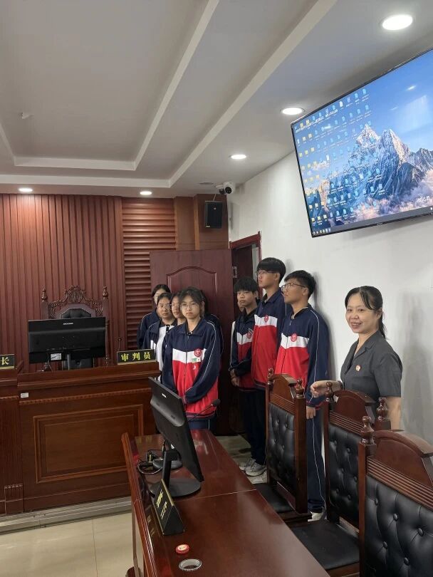 随后,大家步入审判法庭,触摸法台、试坐法椅,聆听关于法徽、法槌象征意义的讲解,对法庭布局与庭审程序有了直观认知,法治意识在潜移默化中生根萌芽。