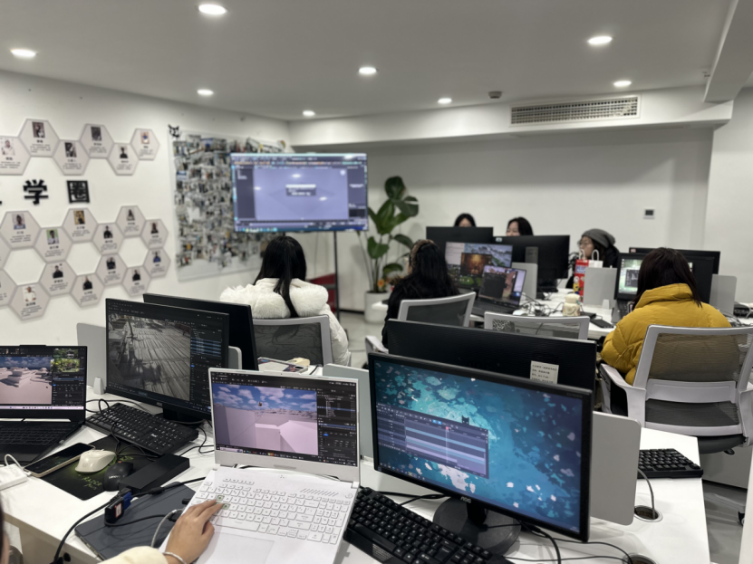 (图为公司技术人员,给大学生们在公司办公场地,进行虚幻引擎UE5的技能指点)
