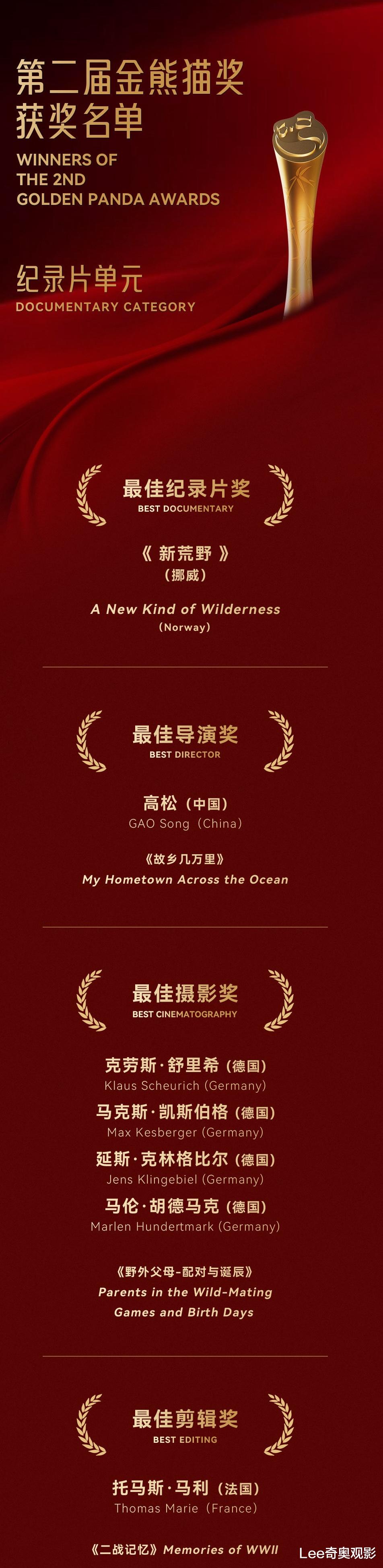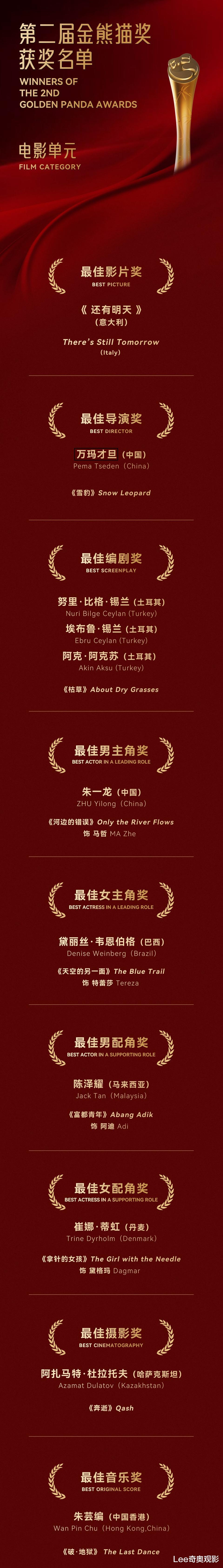 第二届金熊猫奖完整获奖名单出炉!意大利影片《还有明天》获得最佳影片奖,朱一龙凭借《河边的错误》获得影帝,巴西女演员黛丽丝·韦恩伯格凭借《天空的另一面》获得影后,《山花烂漫时》获得最佳剧集奖,唐嫣凭借《繁花》获得视后,吴镇宇凭借《边水往事》获得视帝。