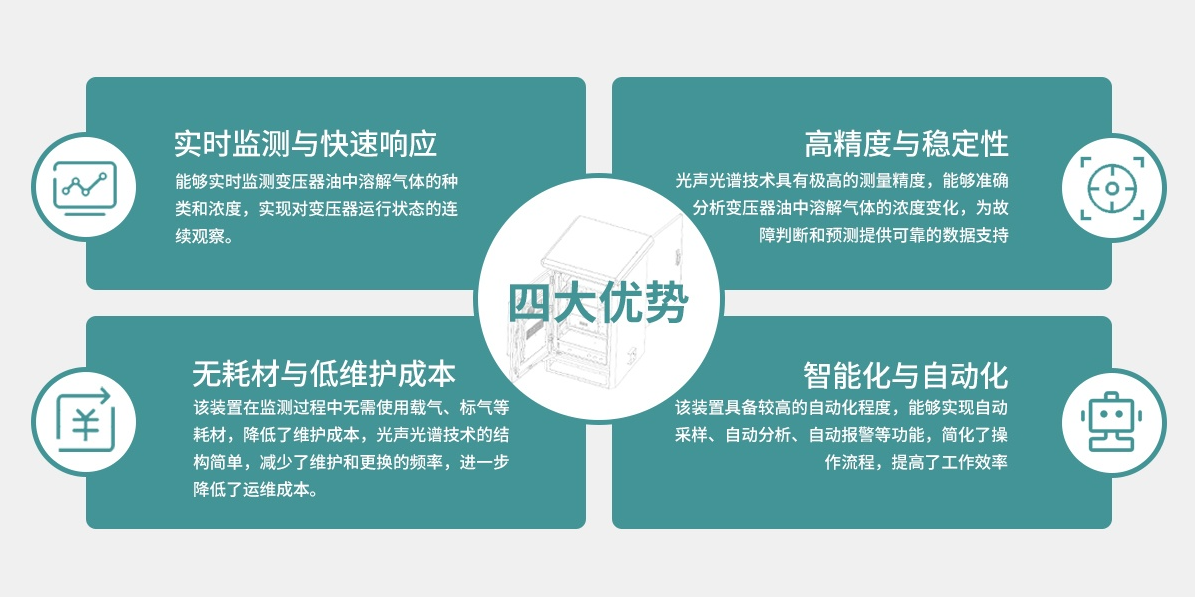 核心优势方面,该公司的GDGA-PS-OL系列产品采用激光光声光谱技术与窄线宽DFB激光器,抗交叉干扰能力强,解决了传统滤光片技术光谱过宽导致的干扰问题,检测响应速度快且重复性好。在检测性能上,可一次性完成七种特征气体及微水的检测,最小采样周期仅1小时,检测精度达ppm量级,优于国内外同类产品,完全符合Q∕GDW 10536-2021标准要求。脱气模块采用持续式等量进回油原理,结构紧凑、运行稳定,是长期可靠监测的基础。
