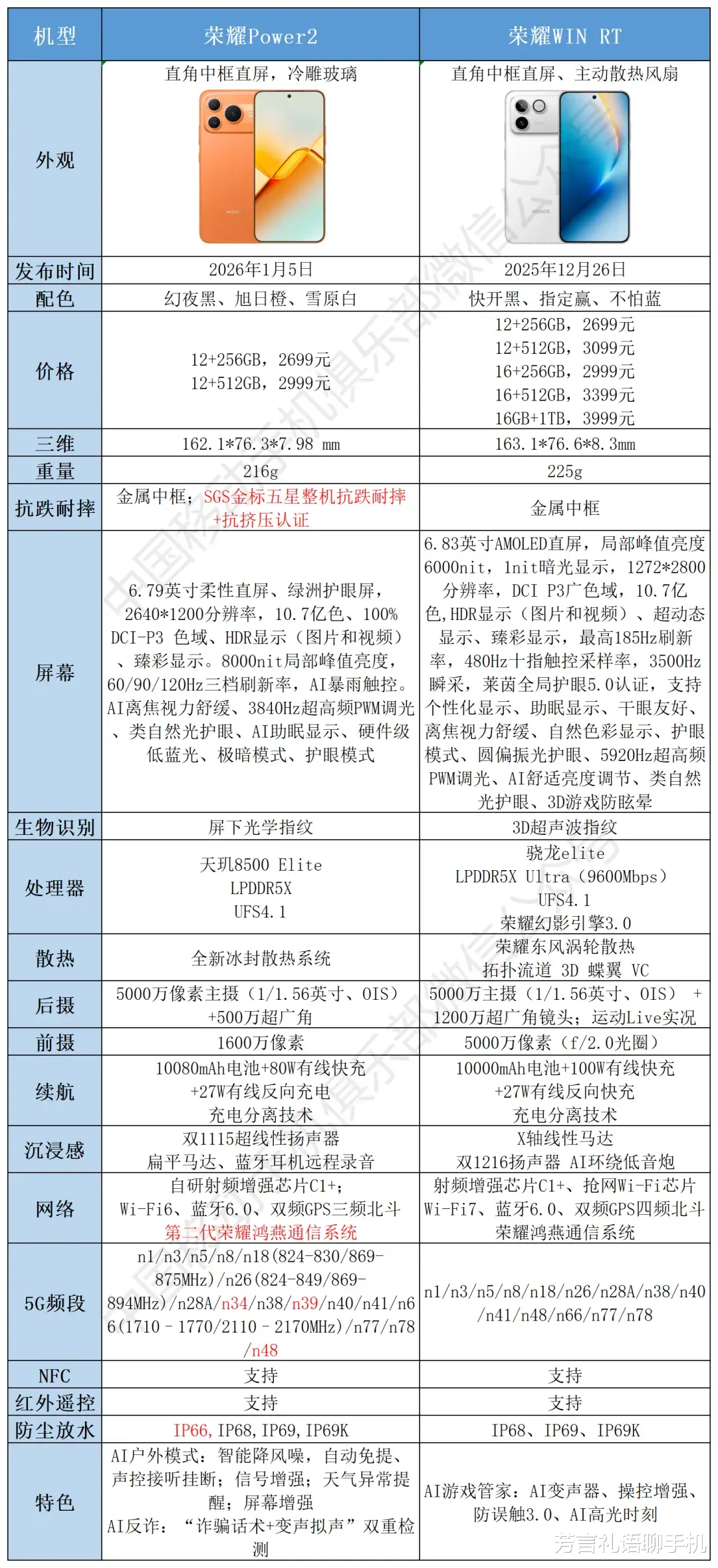 首先,两款手机在定位上是有明显区别的。荣耀WIN RT主打电竞游戏体验,因此整体配置向游戏体验倾斜。荣耀Power2则主打轻户外,在三防、网络、续航、户外模式方面会有侧重。因此,两款手机面向的核心人群是不一样的,说无脑选某一款肯定是不合适的。