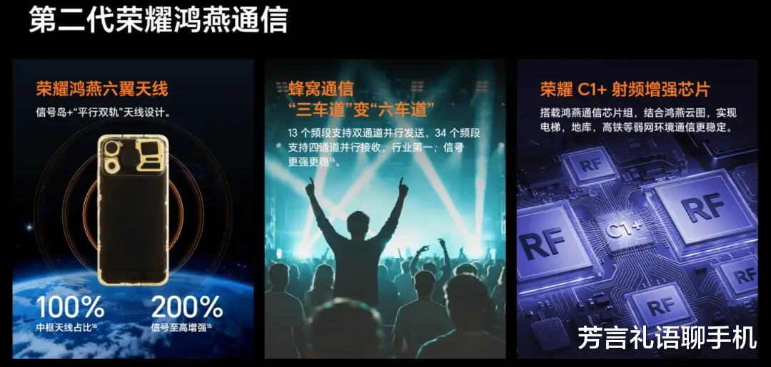 第二是通信。配备“第二代荣耀鸿燕通信系统”,纸面上是比荣耀WIN RT高出一代的。它的天线设计得非常满,采用信号岛+“平行双轨”天线设计,中框天线占比100%,信号至高增强200%。在蜂窝通信方面,通信通道数量行业第一(截至2026年1月5日),其中13个频段支持双通道并行发送,34个频段支持四通道并行接收,信号更强更稳。官方号称“电梯信号王”,获得“电梯强信号”与“精准导航”双场景五星认证,无网电梯开门即连。