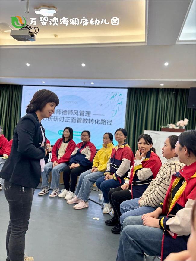 培训中,通过师德案例的剖析,从秩序混乱到午睡守纪,老师们沉浸式分析,把抽象说教换成游戏化引导,用“情感卡片”“可视化规则图”带娃认识情绪、学会表达。