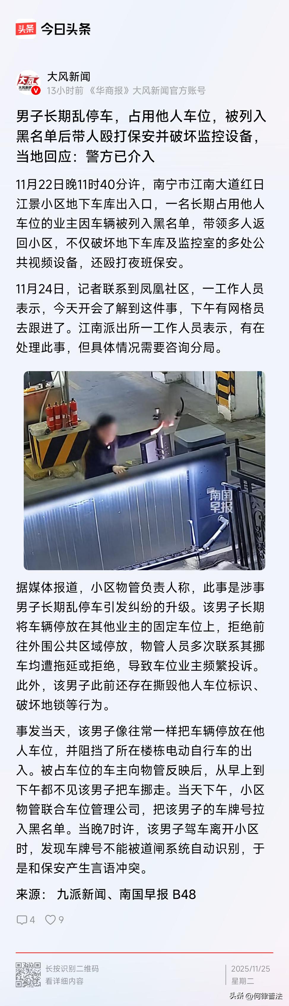广西南宁,一男子长期乱停车,占用他人车位,而且最为过分的是,被列入黑名单后带人殴打保安并破坏监控设备,对此当地回应:警方已介入!网友纷纷留言:哪里来的底气?