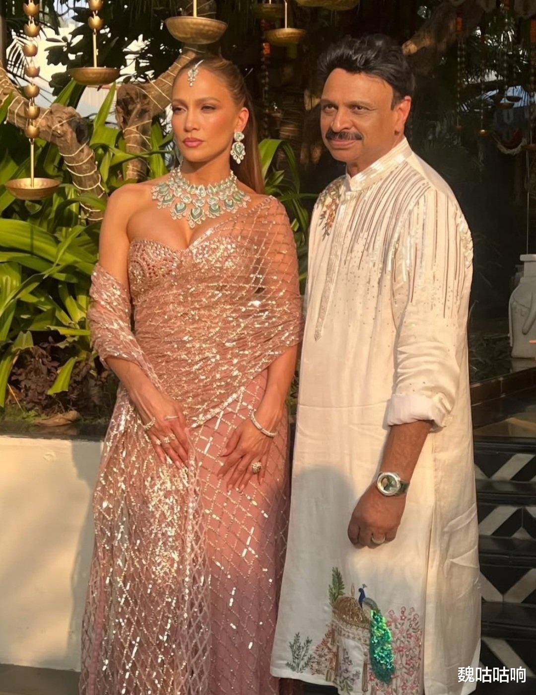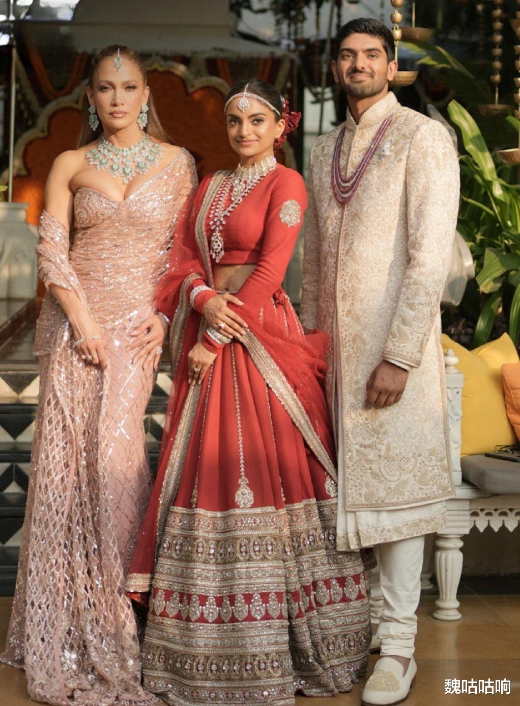 在正式婚礼仪式环节,她身着一袭缀满装饰的优雅纱丽(embellished saree),佩戴祖母绿珠宝,与新婚夫妇合影,展现了对印度文化的尊重。