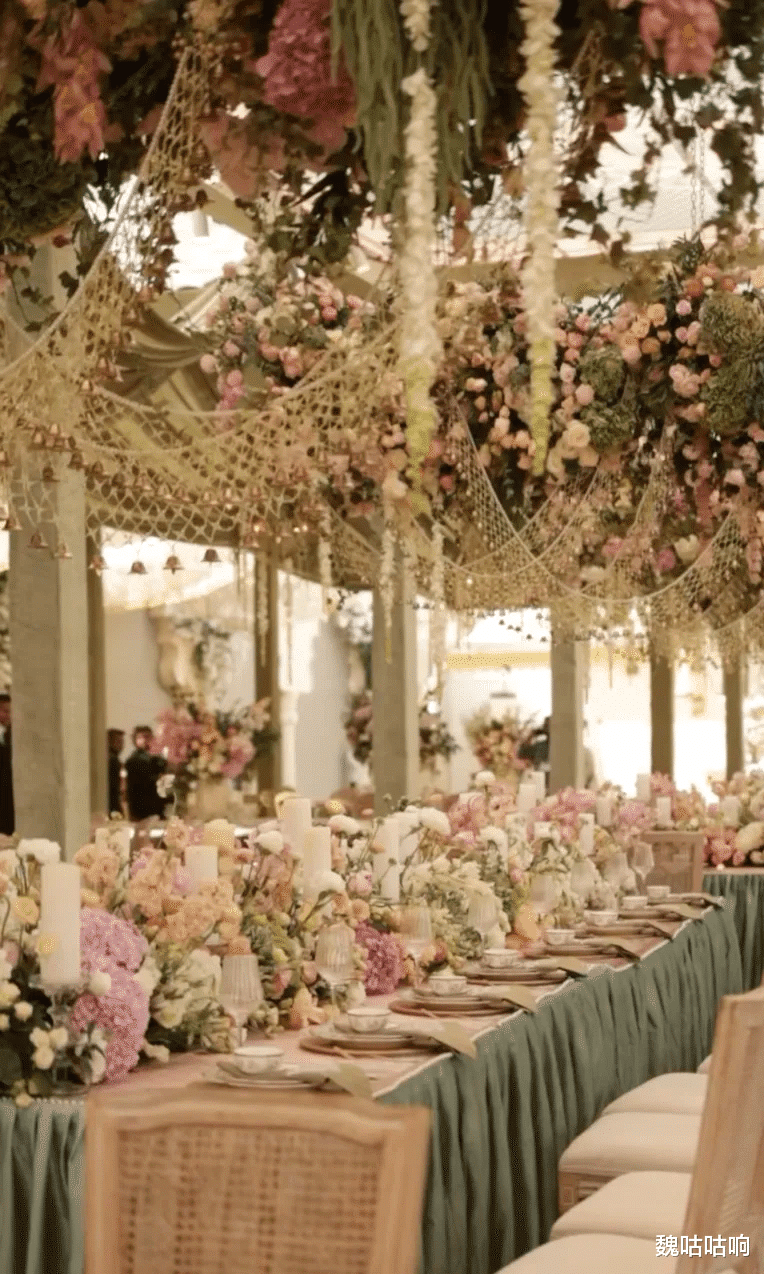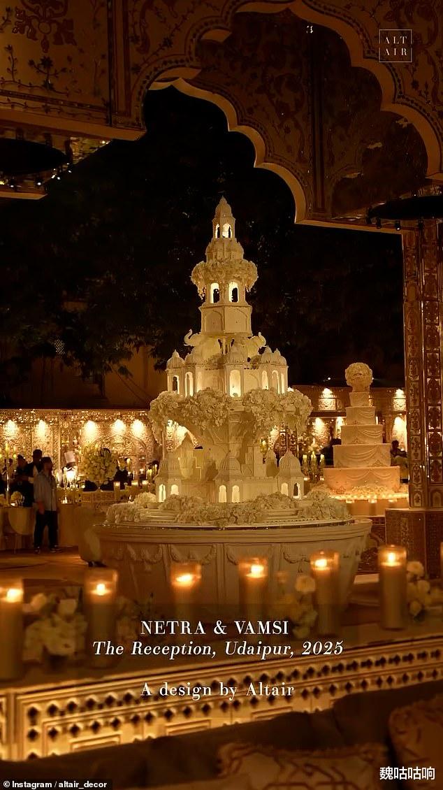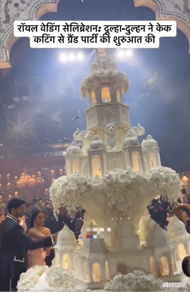 婚礼现场最令人叹为观止的视觉奇观,莫过于那座高达15英尺(约4.5米)的全白色多层蛋糕,这款由常驻巴黎的顶级甜品大师Bastien Blanc-Tailleu亲手定制的杰作,外形酷似一座"迷你宫殿",表面精细雕刻着大象、老虎以及仿佛从顶部倾泻而下的瀑布般鲜花 。