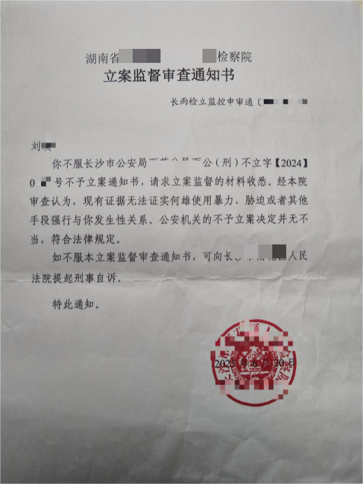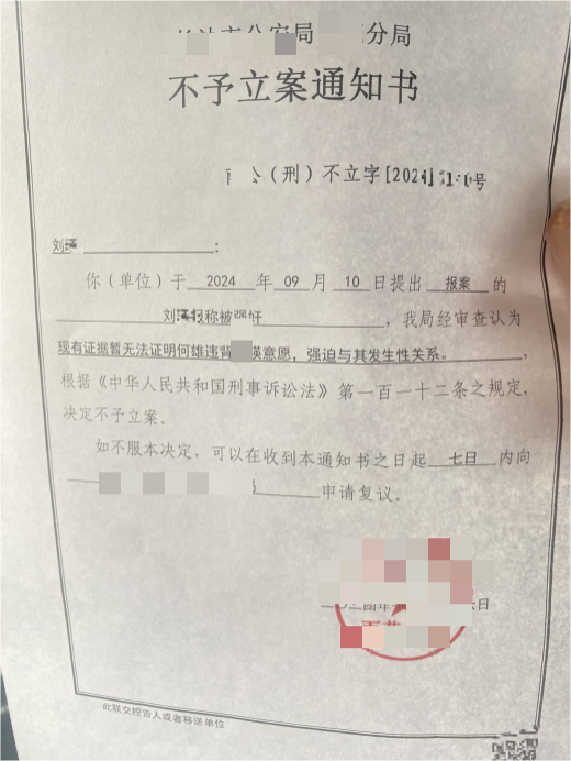 2024年9月6日,刘女士二次报案,案件由雨花公安部门彭某领导团队负责。66天等待后,2024年11月12日,湖南公安短信告知案件已受理为刑事案件;11月26日上午,法制大队称“案件已立案待领导确认”,可当天下午,警方就以“证据不足”出具《不予立案通知书》。