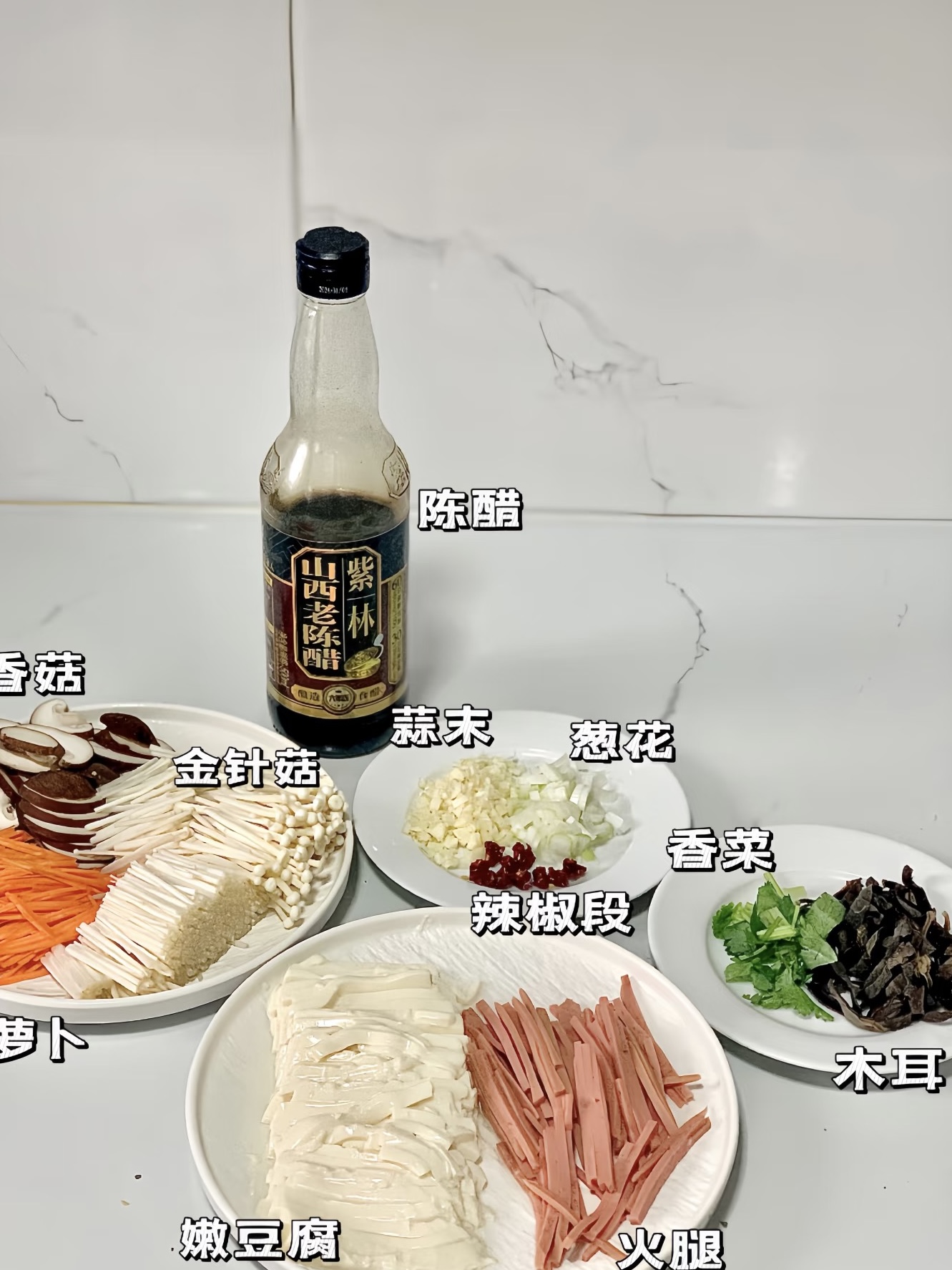 先别被“酸辣”吓退,家常版用料全是超市常驻嘉宾:盒装嫩豆腐一块、金针菇一小把、泡发的木耳五六朵、火腿半根、胡萝卜三分之一段,再抓点香菜、葱花、蒜末,成本不到十块钱。酸辣之魂只有两样:山西老陈醋+干辣椒段,别的都是配角。