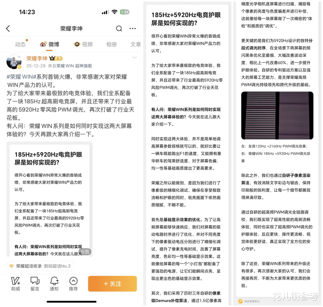 荣耀李坤对此做出过公开回答。大致总结一下就是,荣耀并非简单地调高屏幕参数规格,而是通过优化基础显示效果、采用像素级Demura补偿算法,以及专门针对5920Hz设计的分段式调光时序,从而确保流畅操作和护眼的同时,低亮度也能做到画质细腻、不糊不脏。