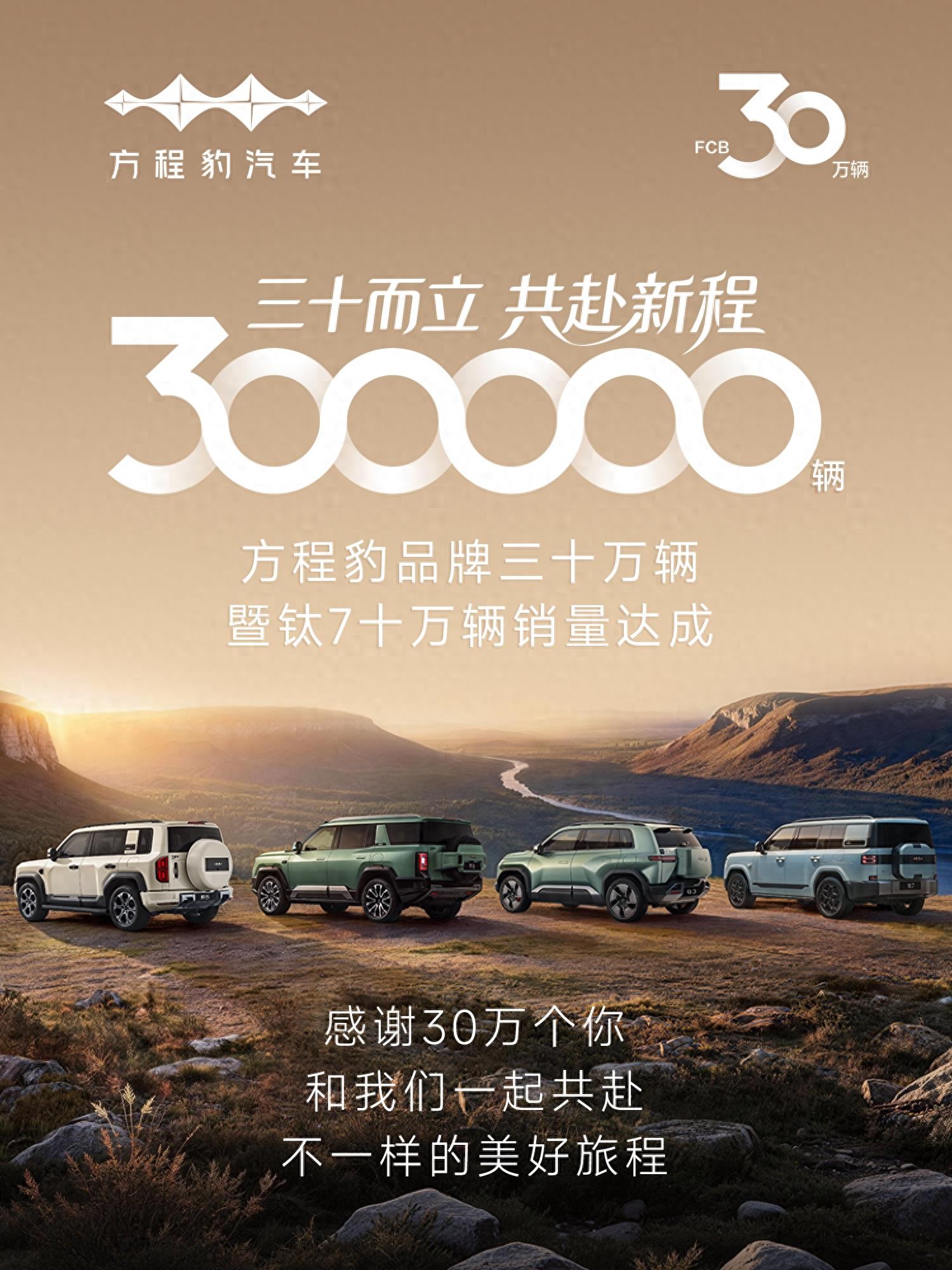 “三十而立”,未来可期。从开创者到领跑者,30万辆是方程豹的又一新起点,26年的方程豹又将带来怎样的惊喜?非常值得期待。
