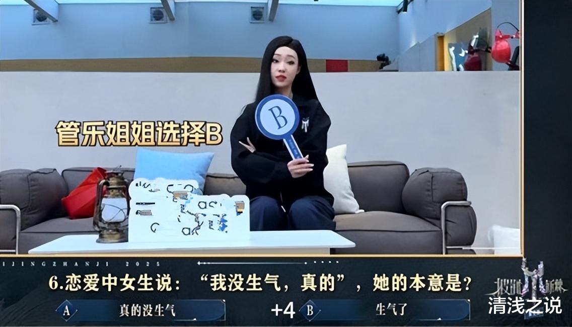 事实证明王铮亮是对的,随着五位助阵披哥5五公的浪姐都选择了B,答案就锁定为B,因为选择B的人最多嘛。而五位浪姐一致的选择也非常能代表不少女生的真实心理,恋爱吵架时说“我没生气,真的”就是生气。