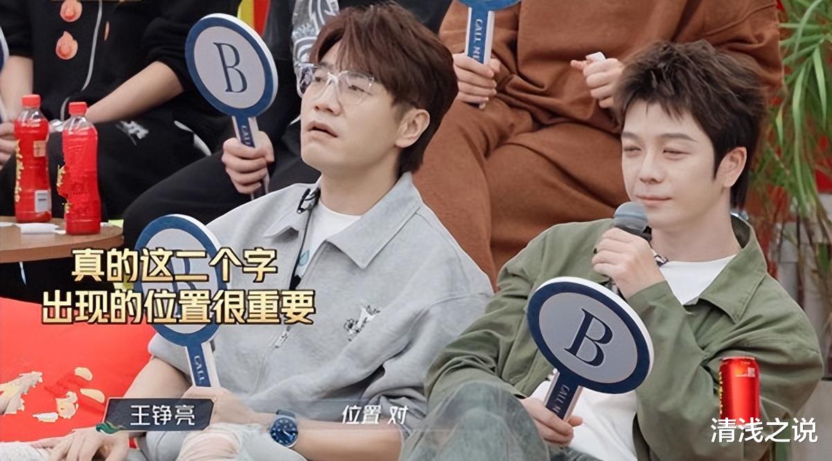 “明人不说暗话”之快问快答第六题是“恋爱中女生说‘我没生气,真的’。她的本意是什么?”答案A是真的没生气,答案B是生气了。哥哥们需要从两个答案中选择一个,王铮亮胸有成竹地说“这个想都不用想,我跟你说,一定是B。”他觉得女生说那话就是生气了,如果女生说“‘我真的没生气’可能就是没生气,但要说‘我没生气,真的’,就真的是生气了。”“真的”二字出现的位置很重要,不同的位置表达的意思可能完全相反。