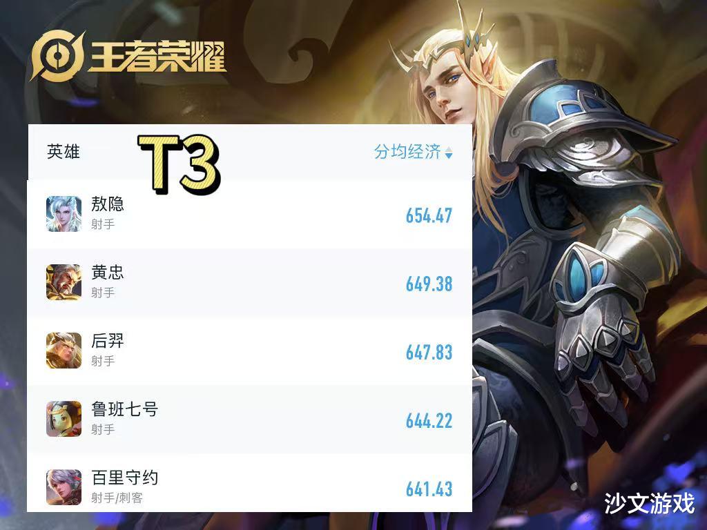 排在发育路发育榜分均经济T3的英雄有敖隐、黄忠、后羿、鲁班七号、百里守约,这些英雄的分均经济在640局内金币至650局内金币之间。