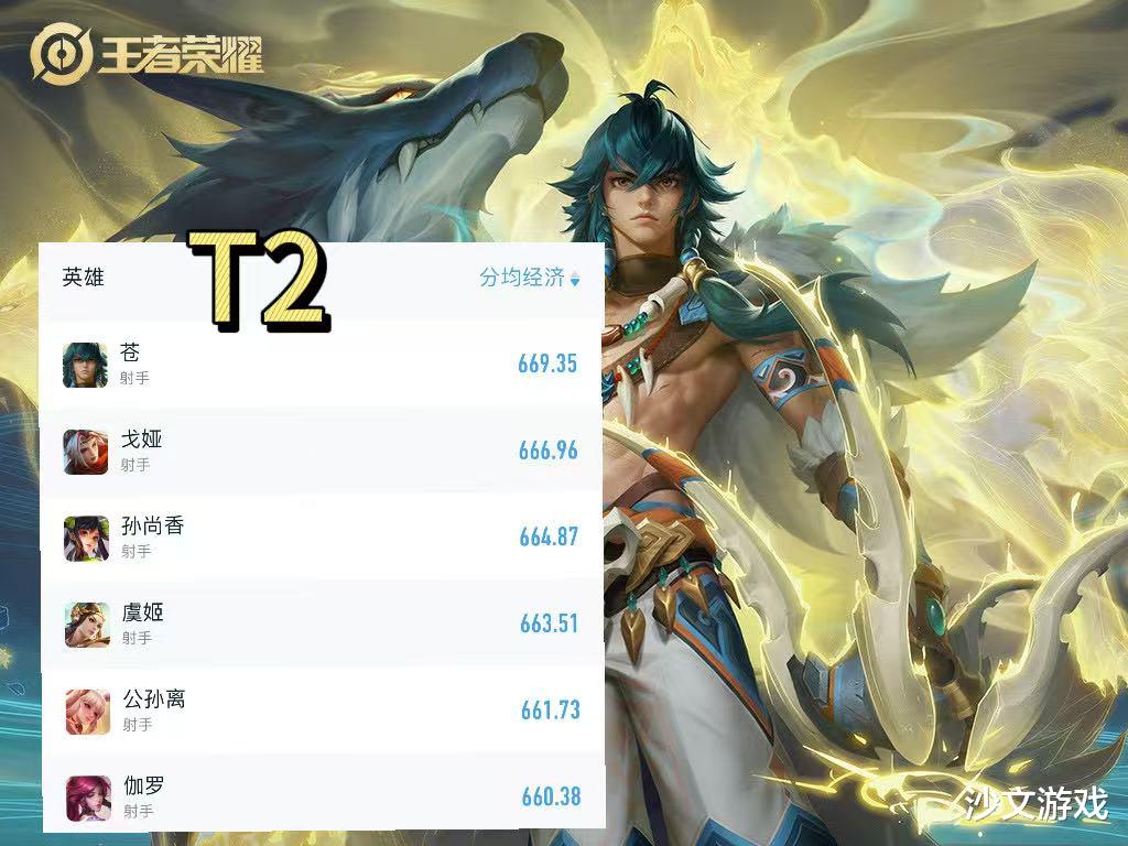 排在发育路发育榜分均经济T2的英雄有苍、戈娅、孙尚香、虞姬、公孙离、伽罗,这些英雄的分均经济在660局内金币至670局内金币之间。