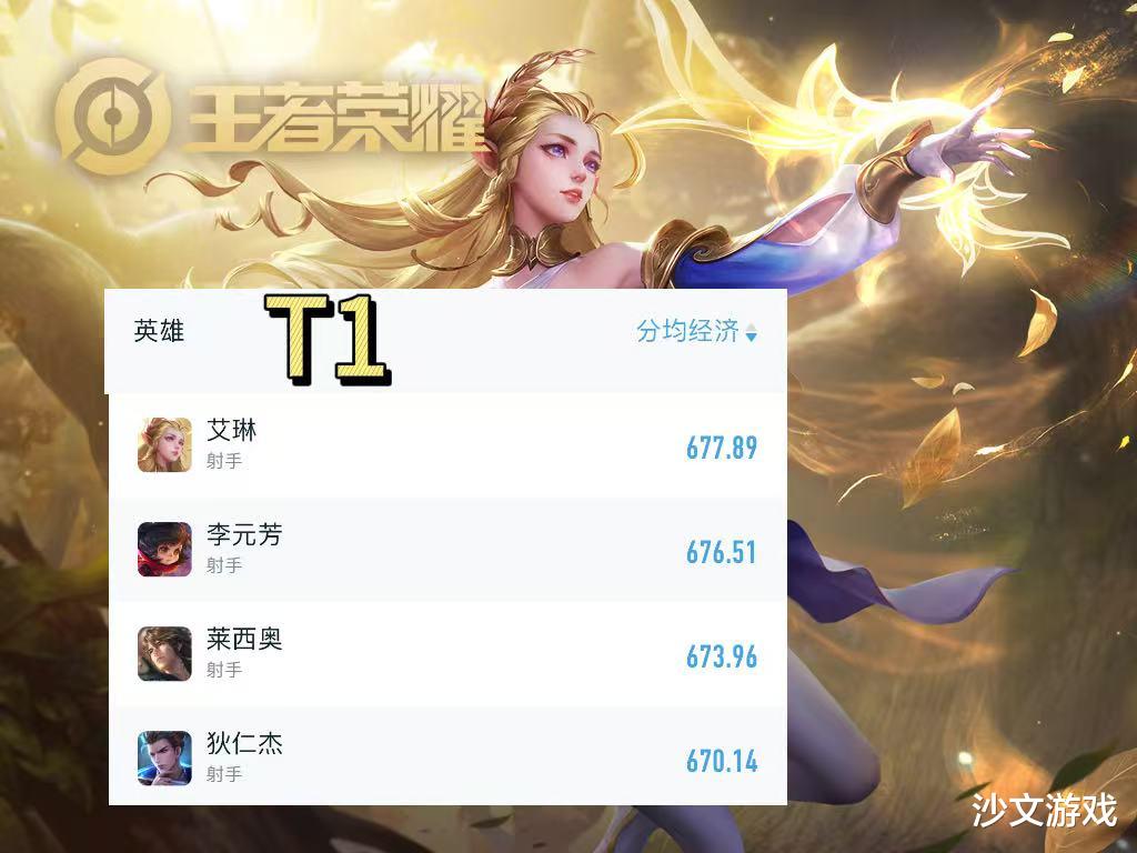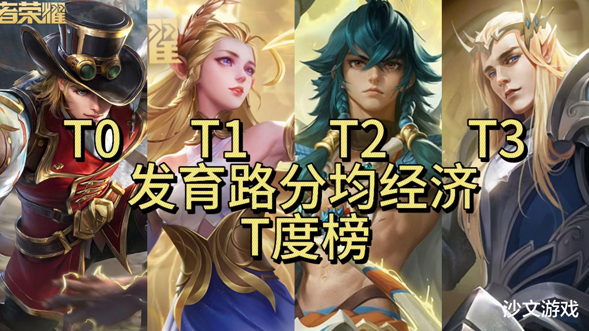 排在发育路发育榜分均经济T1的英雄有艾琳、李元芳、莱西奥、狄仁杰,这些英雄的分均经济在670局内金币至680局内金币之间。