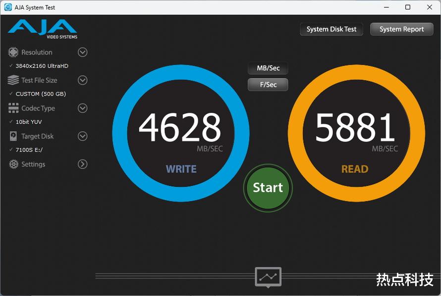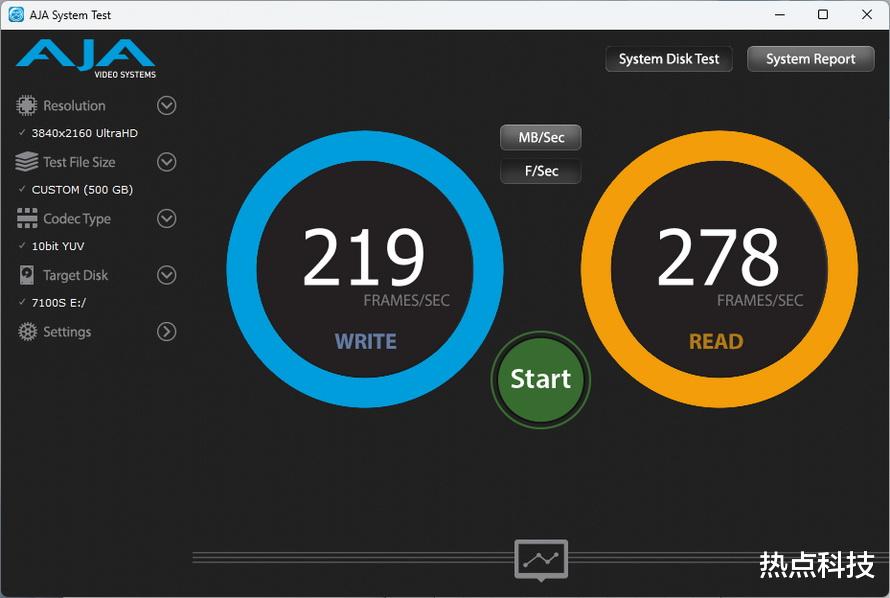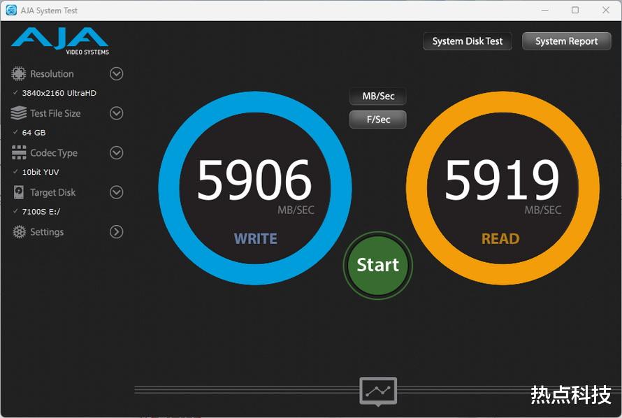 下一项测试是与视频剪辑、记录有关的AJA System Test,设置为4K分辨率,10bit YUV编码,测试的文件大小分为64 GB、500 GB、1800 GB三组。在64GB下,致态TiPlus7100s写入速度为5906 MB/s、279 FPS,读取速度也有5919 MB/s、280 FPS,读写表现相差不大。