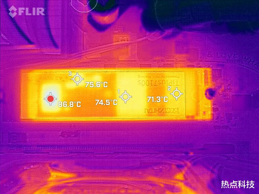 除了在主动散热下测试了致态TiPlus7100s全盘写入性能,我们还测试了致态TiPlus7100s在没有散热片、风扇下的全盘写入性能以及表面温度,其中表面温度是在测试开始后第十分钟测量的。和大部分SSD一样,致态TiPlus7100s最高温出现在主控芯片上,测试时芯片表面温度达到了86.8℃,而两块闪存芯片温度在70℃+。