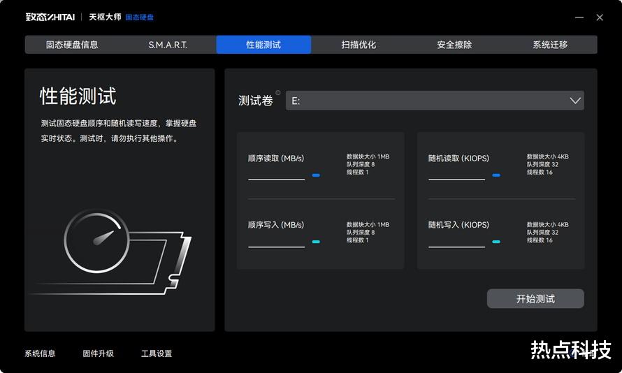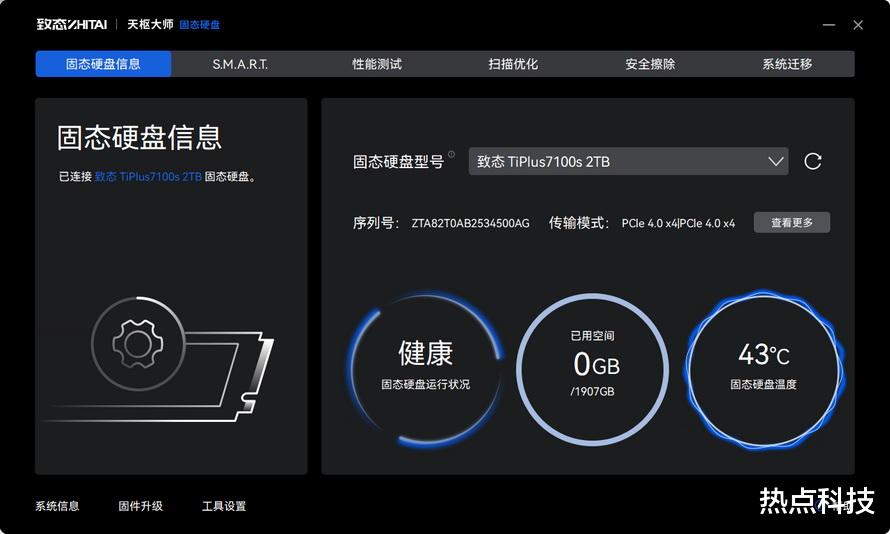 在软件方面,致态TiPlus7100s同样可以使用致态天枢大师固态硬盘管理软件,此次天枢大师还得到了全新升级,用户可以从中查看硬盘信息、扫描优化、安全擦除、迁移系统、更新固件,甚至是跑个分。