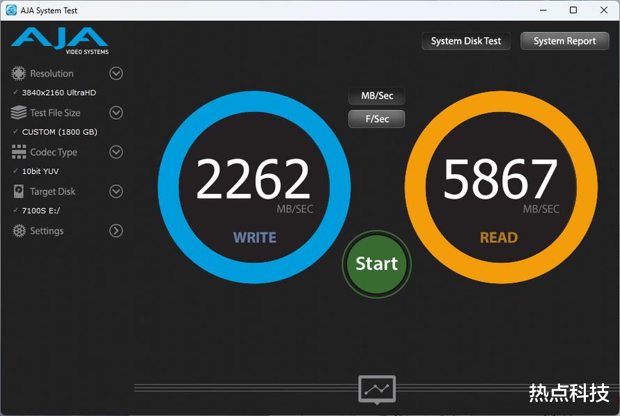 最后是1800 GB文件,在AJA System Test向致态TiPlus7100s写入1800 GB文件后, SSD写入速度为2262 MB/s、107 FPS,读取速度为5867 MB/s、277 FPS,考虑写入1800 GB后SSD已经占用了94%空间,是一个近乎满盘的状态,却能保持2262 MB/s、107 FPS写入速度,表现可谓相当不错。