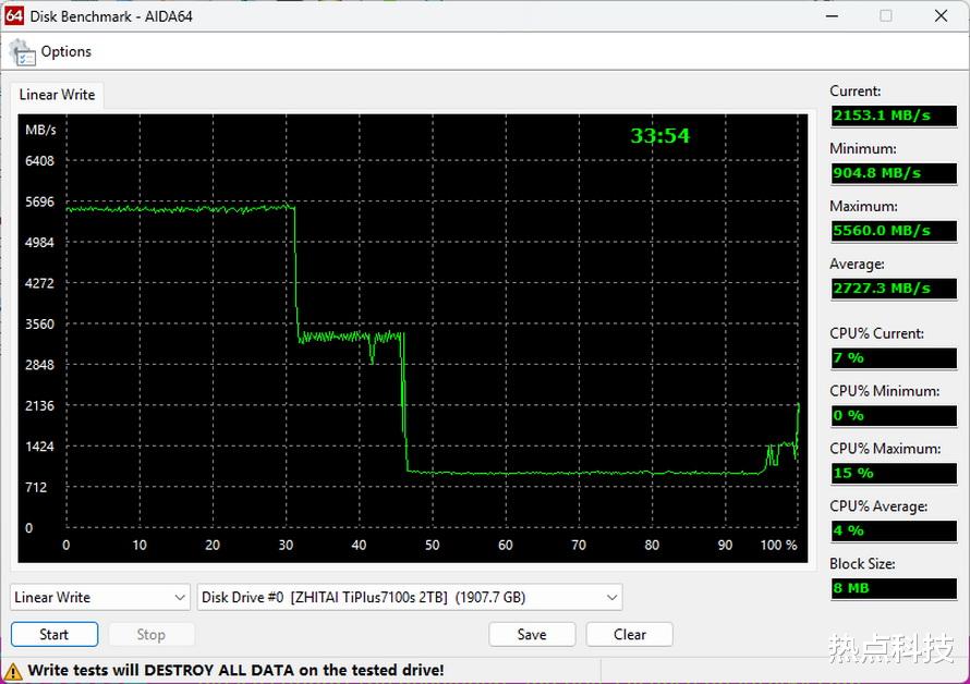 在Linear Write全盘写入测试中,致态TiPlus 7100s耗时为33分54秒,在测试中前32%容量都能保持较高的速度,估计其SLC缓存约为610 GB,在SLC缓存耗尽,SSD速度会分两个阶梯下滑。