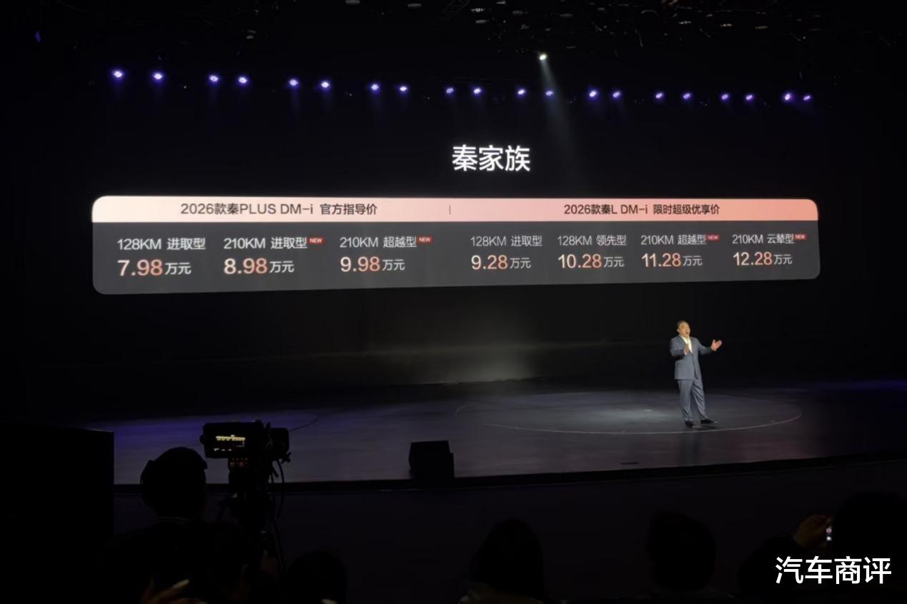 而据《汽车商评》了解,1月8日,比亚迪秦家族迎来开年的首次重磅更新,新推出2026款秦L DM-i、2026款秦PLUS DM-i 210KM长续航版两款车型,前者给到了11.28-12.28万的限时优享价,后者给到了8.98-9.98万的官方指导价,与此同时,还有2026款秦PLUS DM-i 128km进取型,官方指导价7.98万元,进一步降低秦家族的入手门槛。