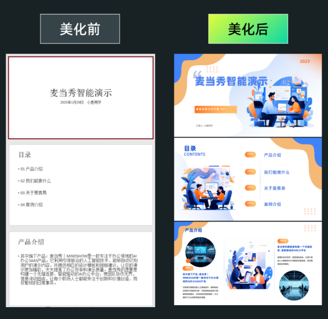 在数字化转型加速的今天,麦当秀(MindShow)作为AI办公领域的创新者,通过自主研发的AI生成PPT技术,正逐步改变传统办公模式。该产品以“智能驱动、高效表达”为核心,为企业与个人用户提供一站式演示解决方案,助力用户聚焦内容本质,释放创造力。